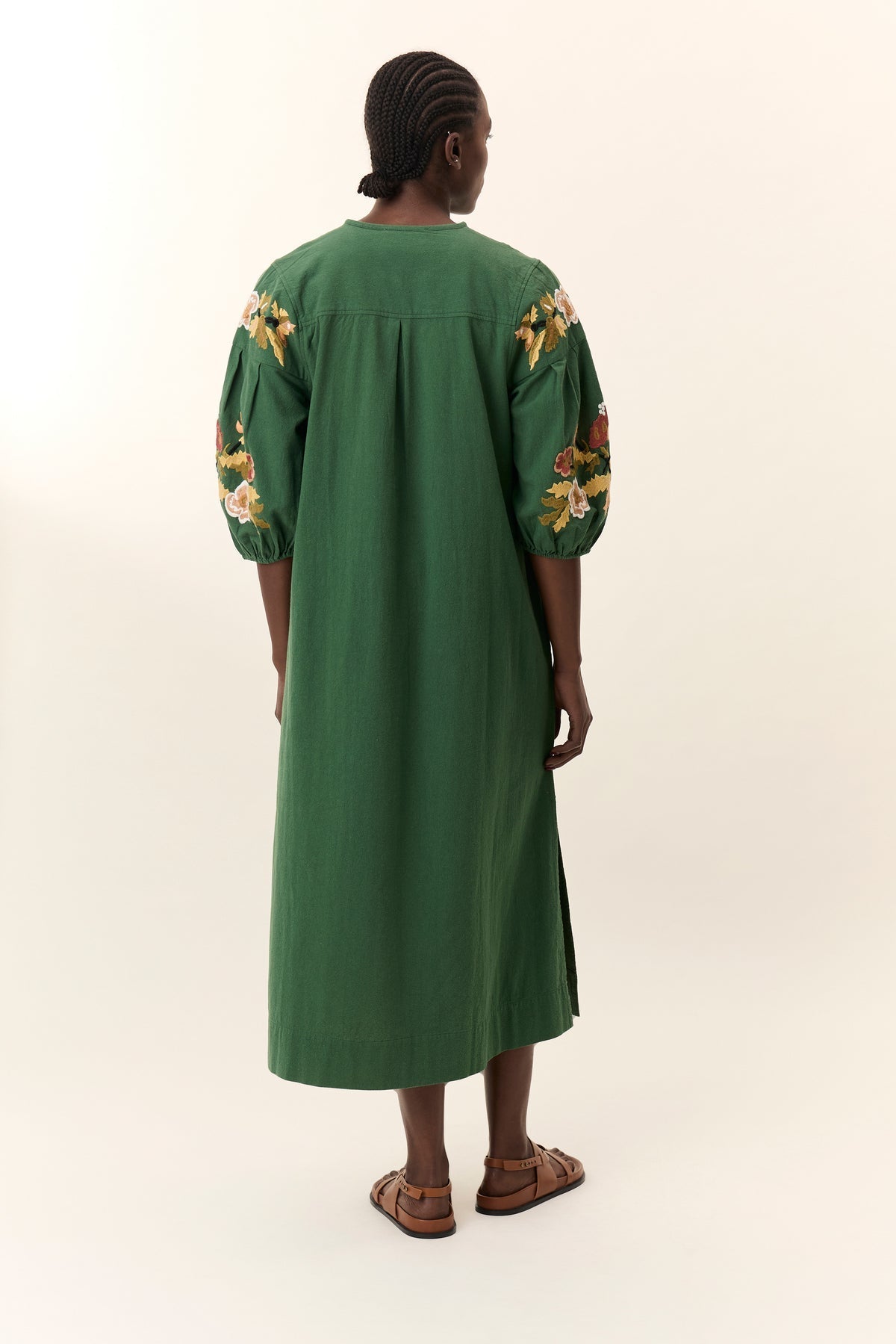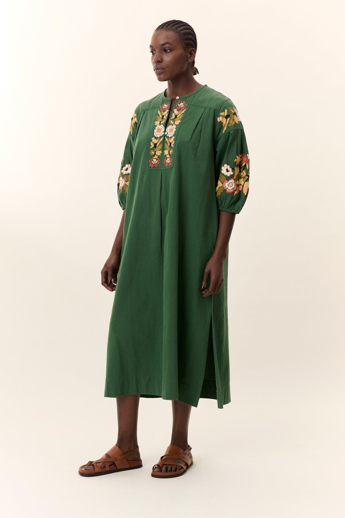 The Rudo Brd dress is made unique by its bohemian style elegance and embroidered details. Its loose, flowing cut ensures optimal comfort while providing a casual chic silhouette. Floral embroidery and slightly puffy 3/4 sleeves add touches of handcrafted sophistication