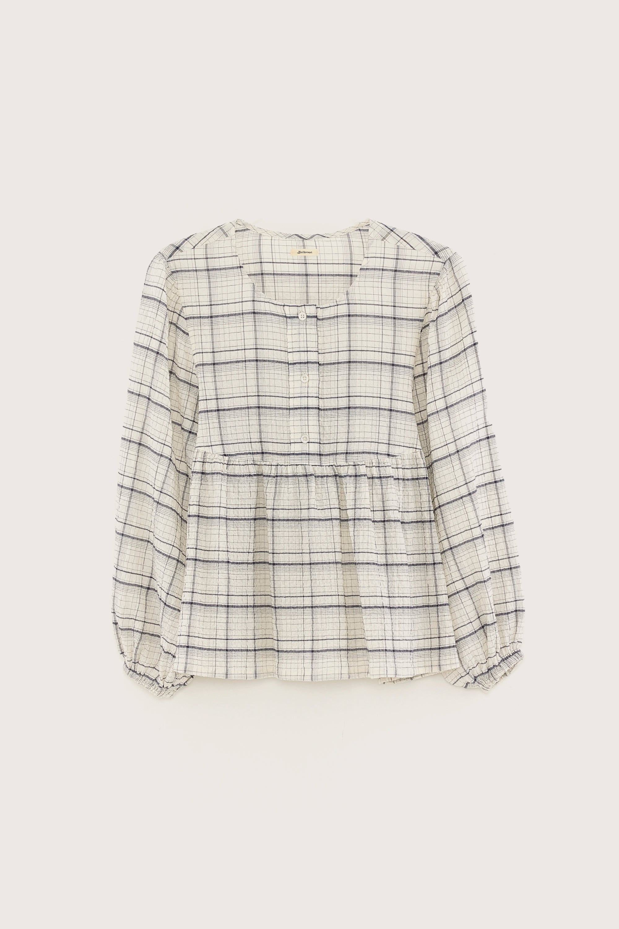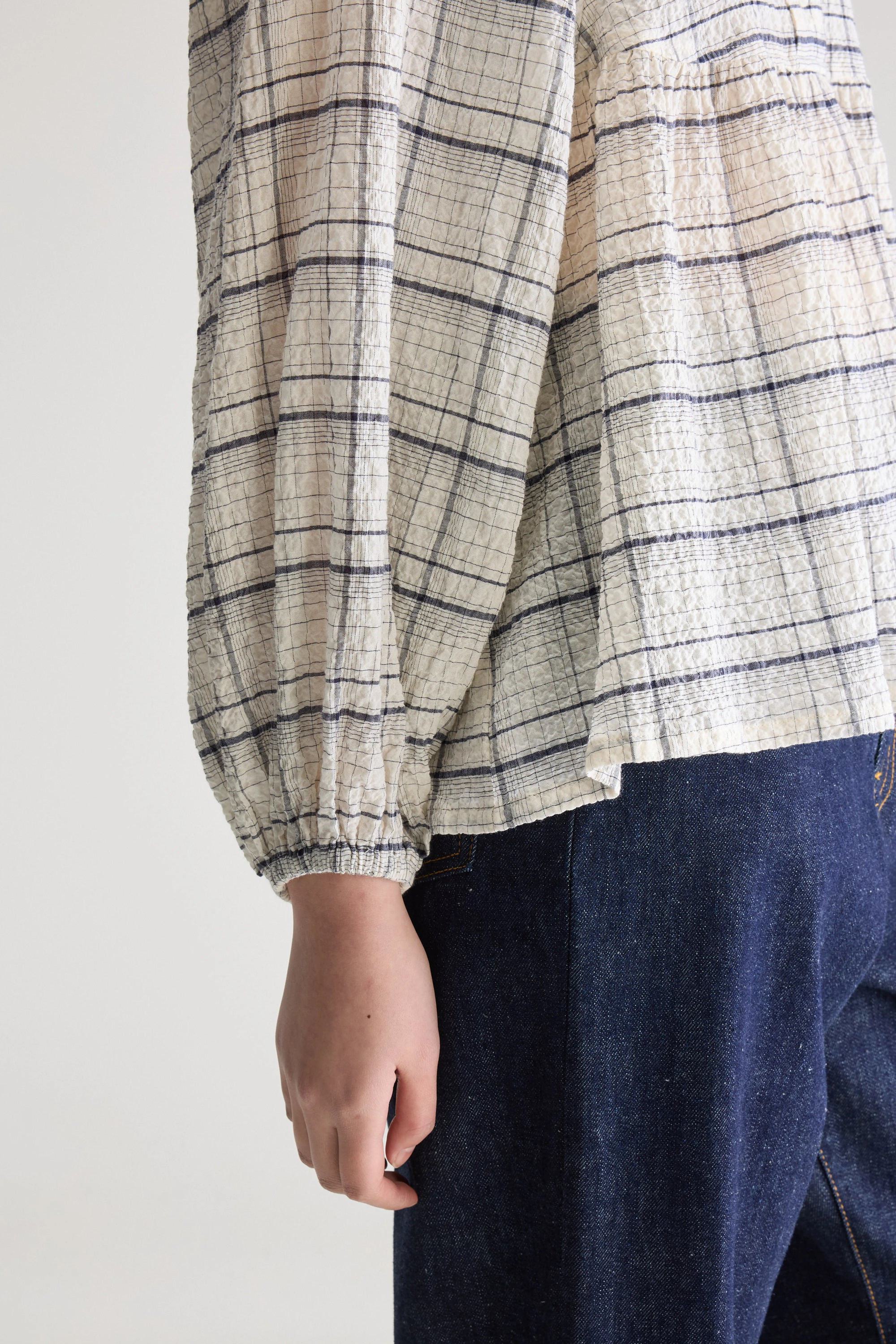 Regular blouse with half-open collar, balloon sleeves and gathered details, made from a seersucker-like checkered cotton blend.