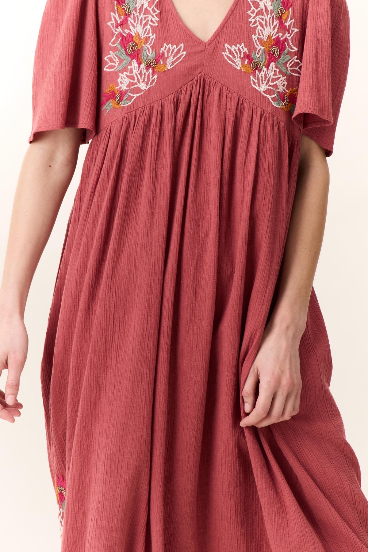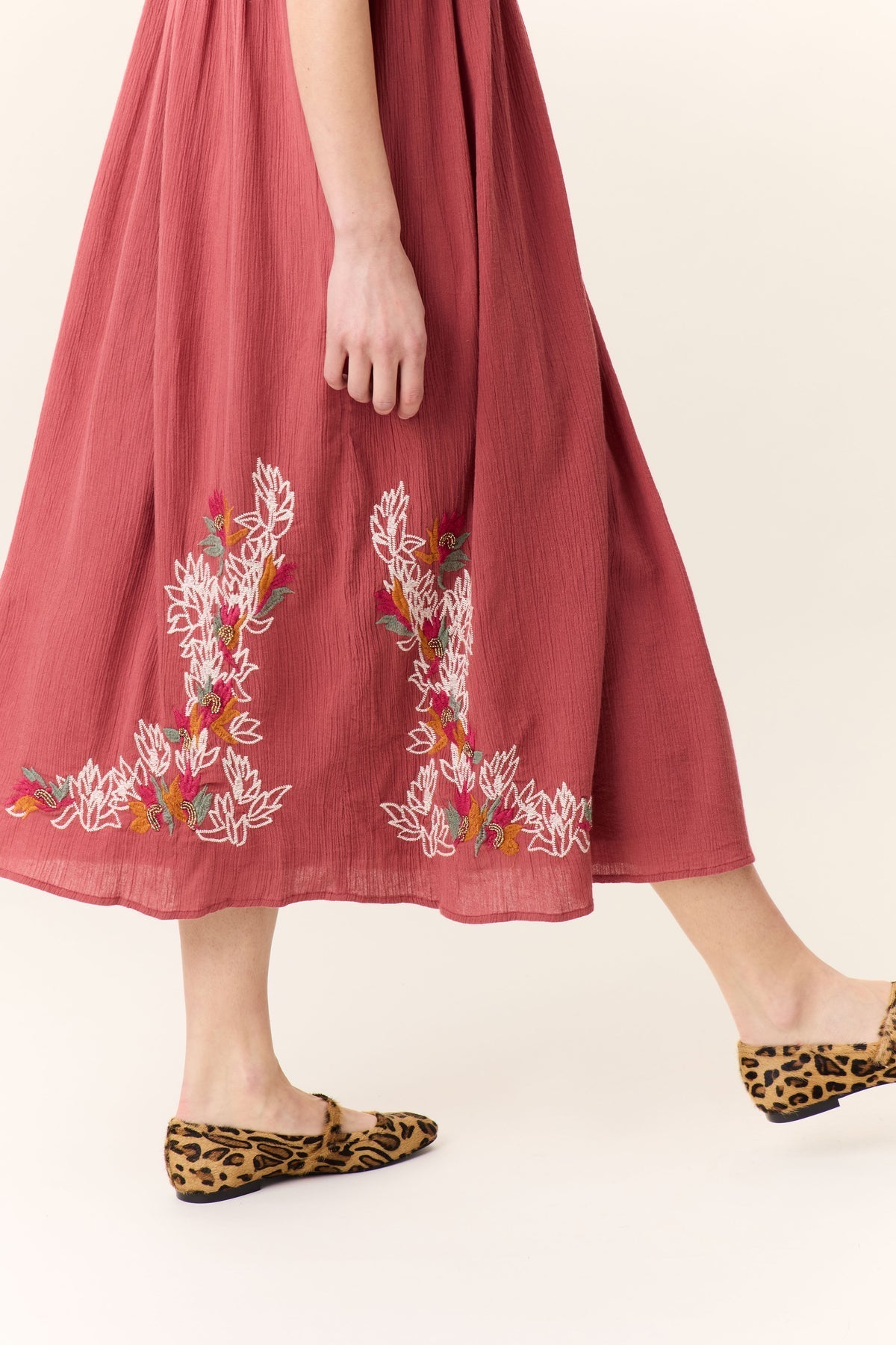 The Risu Pearl dress embodies elegance and celebrates femininity with subtlety. Its flared cut and its gathers bring a touch of lightness and absolute comfort, while its V -neck and its delicate floral embroidery enhance the silhouette of the woman Leon & Harper with refinement