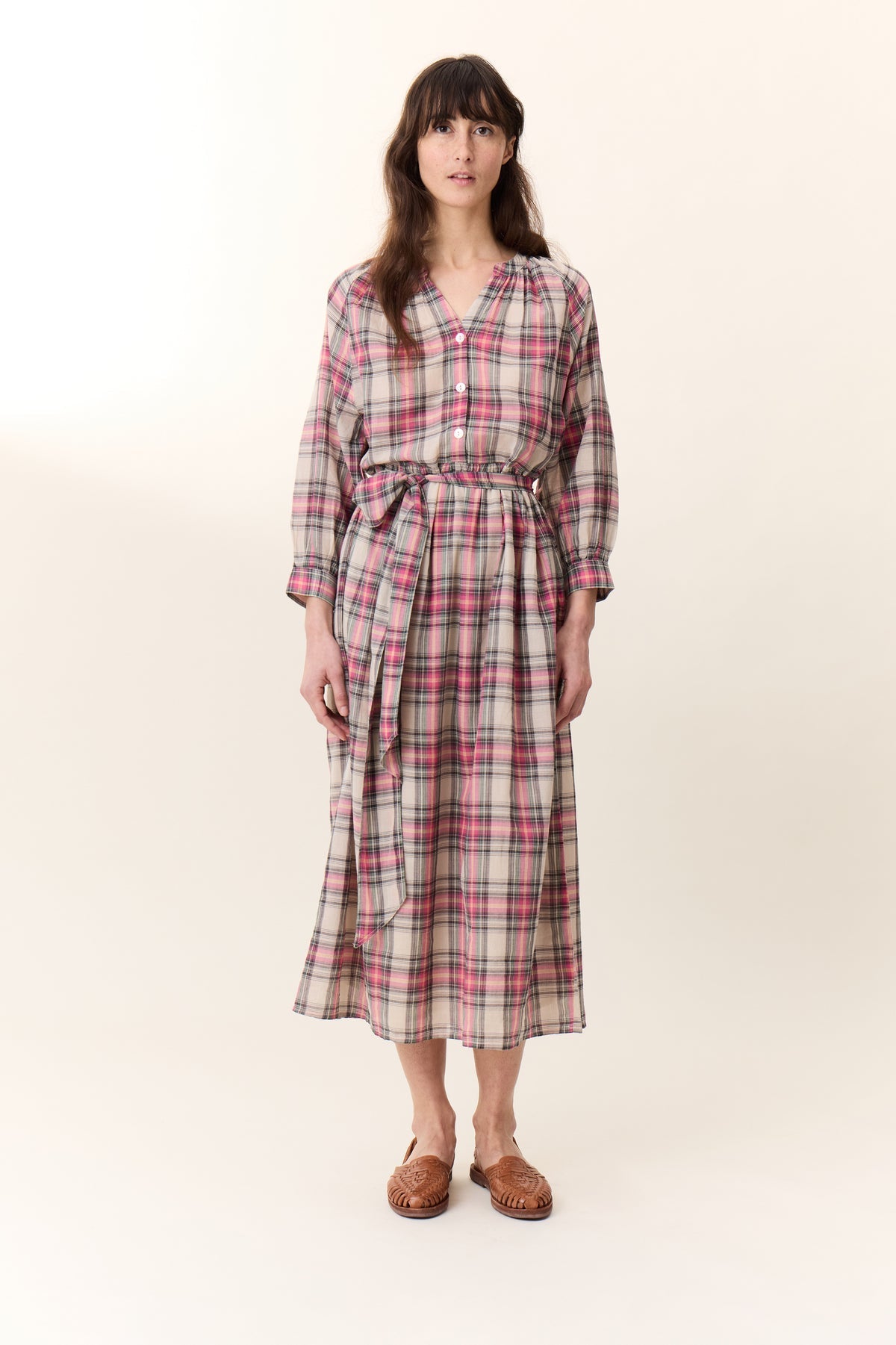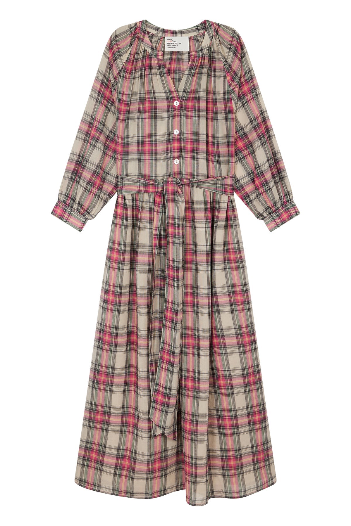 The Runa Crx dress features a colorful and elegant plaid print. Designed with a tied waist, slightly puffy long sleeves, and a loose fit, this dress is both casual and chic. The perfect dress for summer nights or elegant daytime looks
