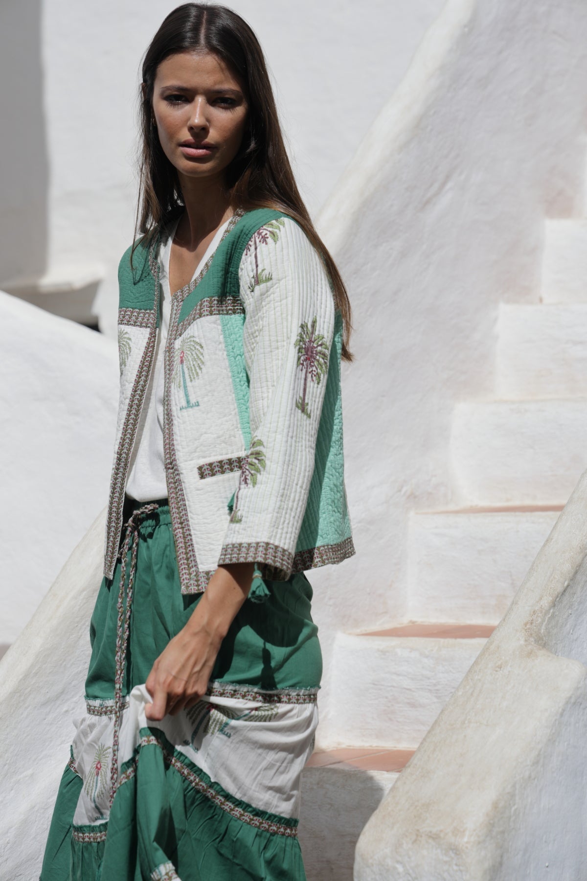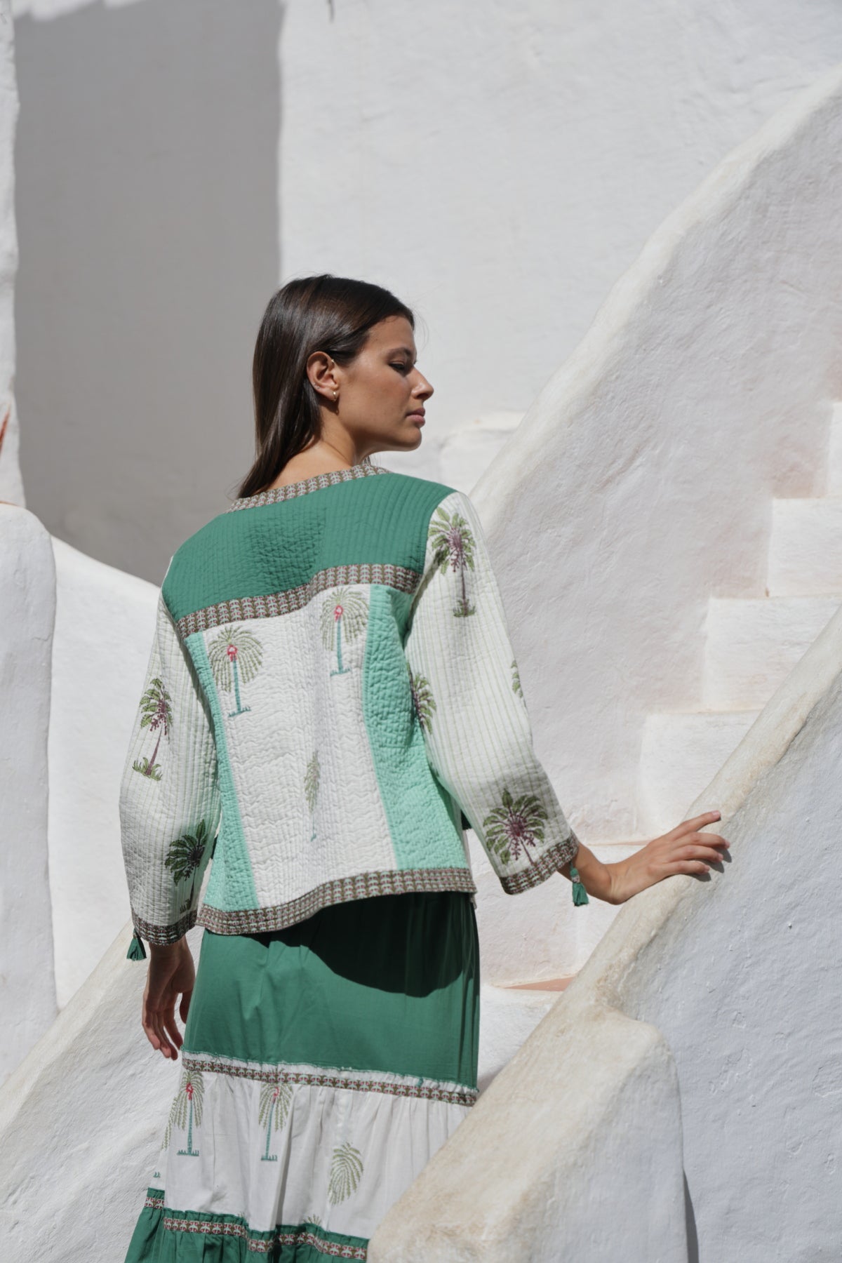 The Symi jacket is the perfect combination of exoticism and bohemian style. Made of cotton, its palm tree print in green and white tones evokes freshness and gives it a sophisticated and elegant air. The long sleeve is enhanced with a contrasting trim and handmade pompom detail, which adds an original and distinctive touch. Its round neck maintains the versatile essence of the garment, allowing you to easily combine it with different looks. Wear it with the Penelope skirt from our collection and you will get a bohemian outfit full of personality!