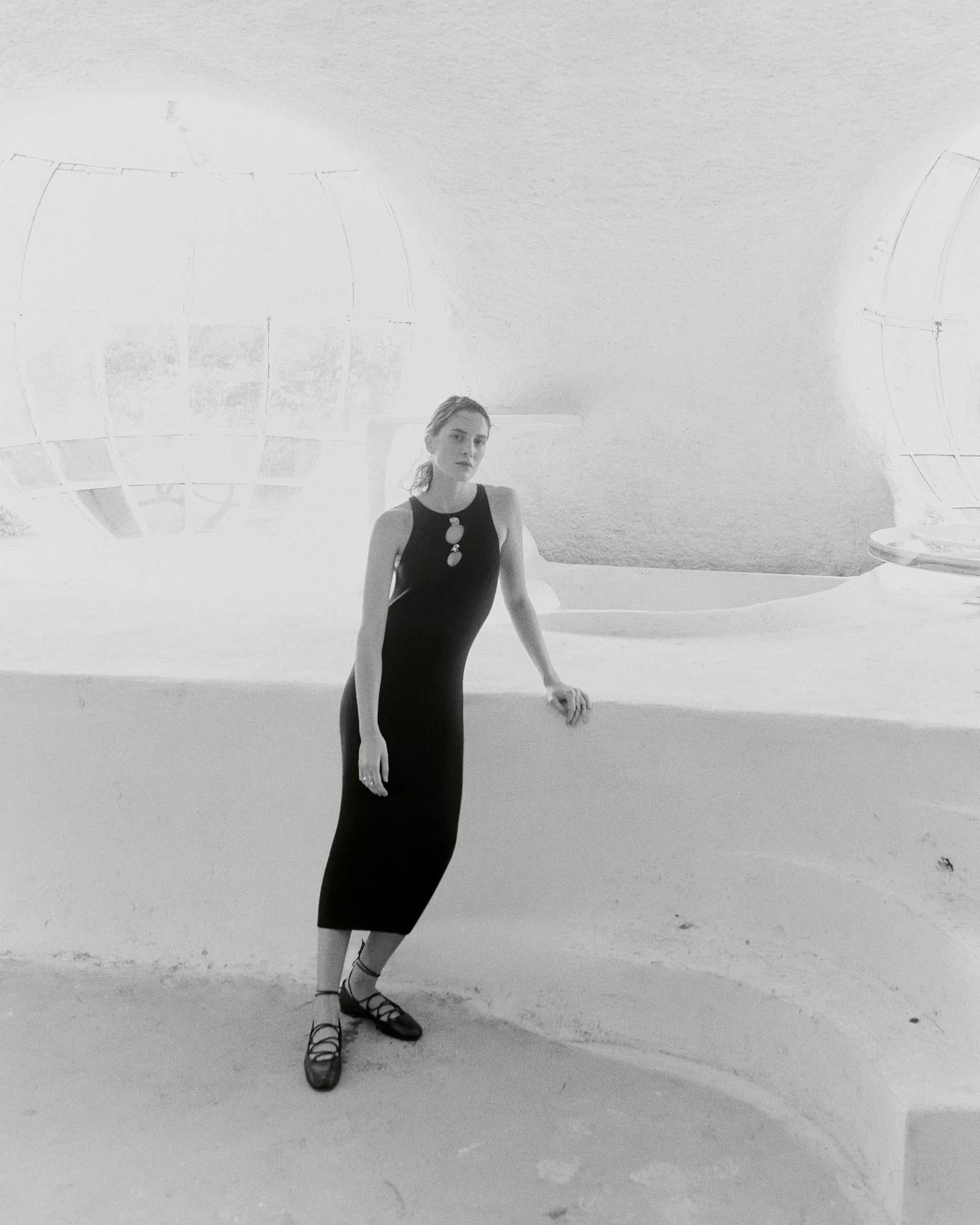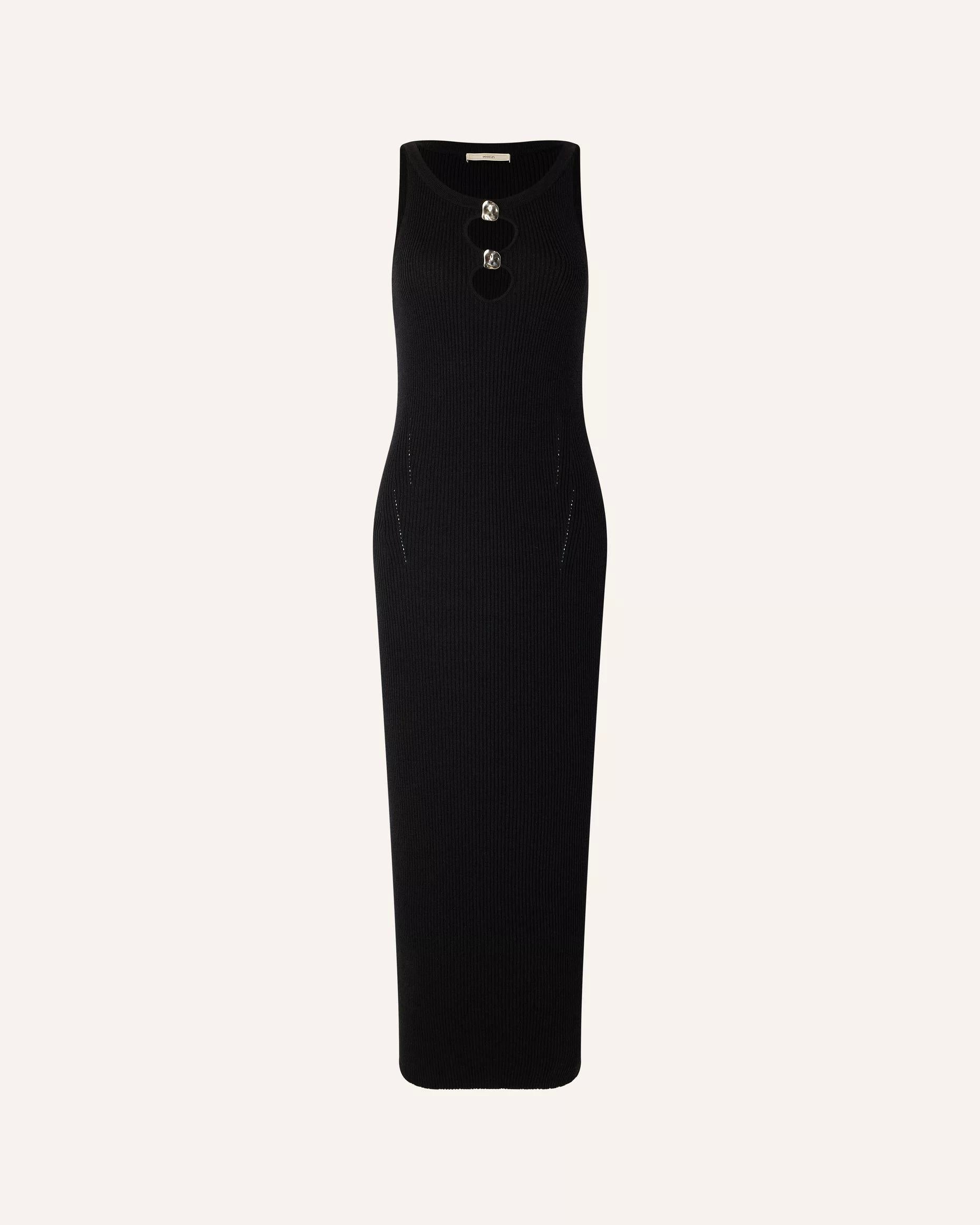 Fitted midi dress with a double teardrop neckline adorned with jewel buttons, in a fine rib knit fabric.