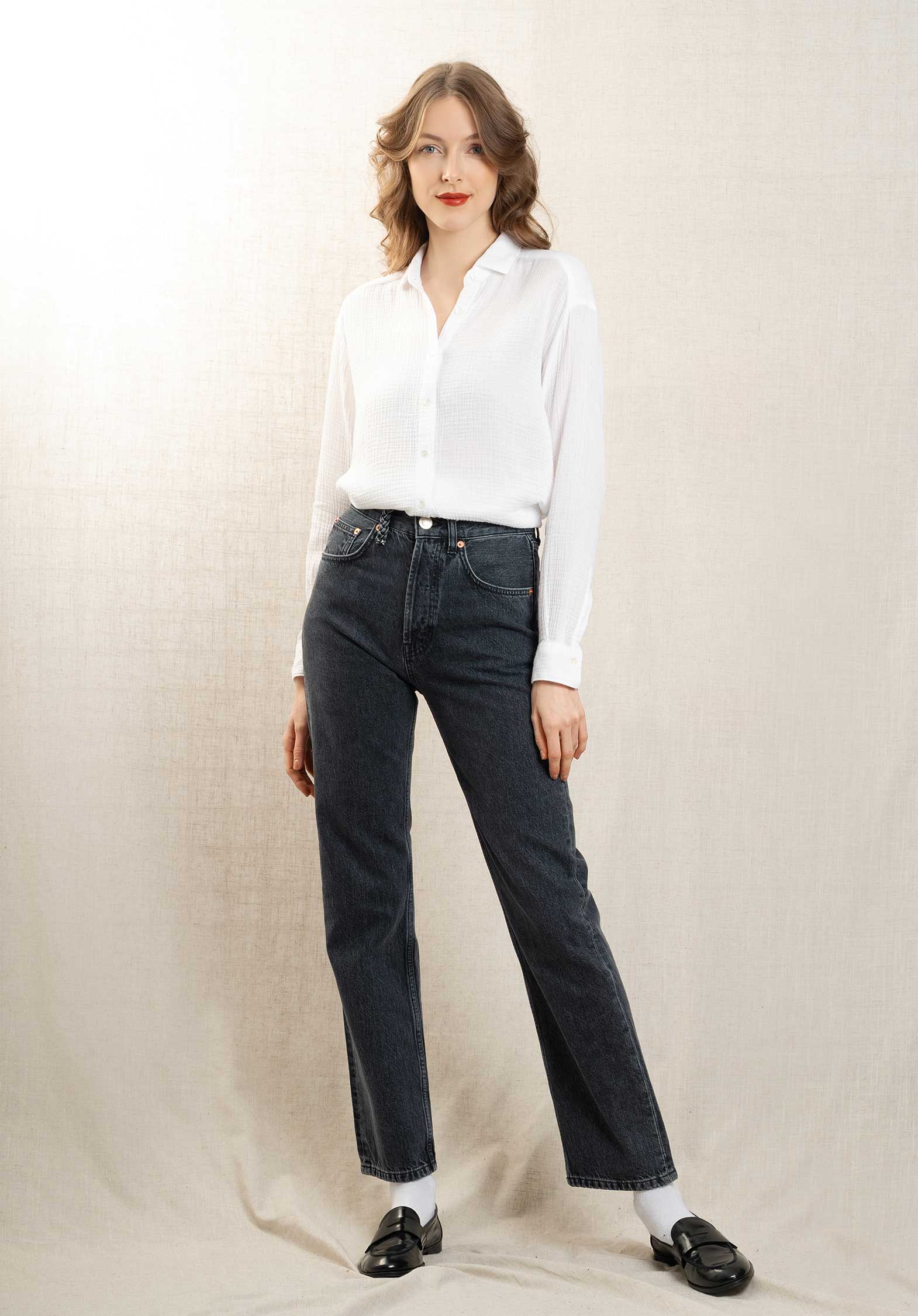 Women's loose-fit shirt in double Cotton Gauze. Dropped armholes and exposed button placket with mother-of-pearl buttons.