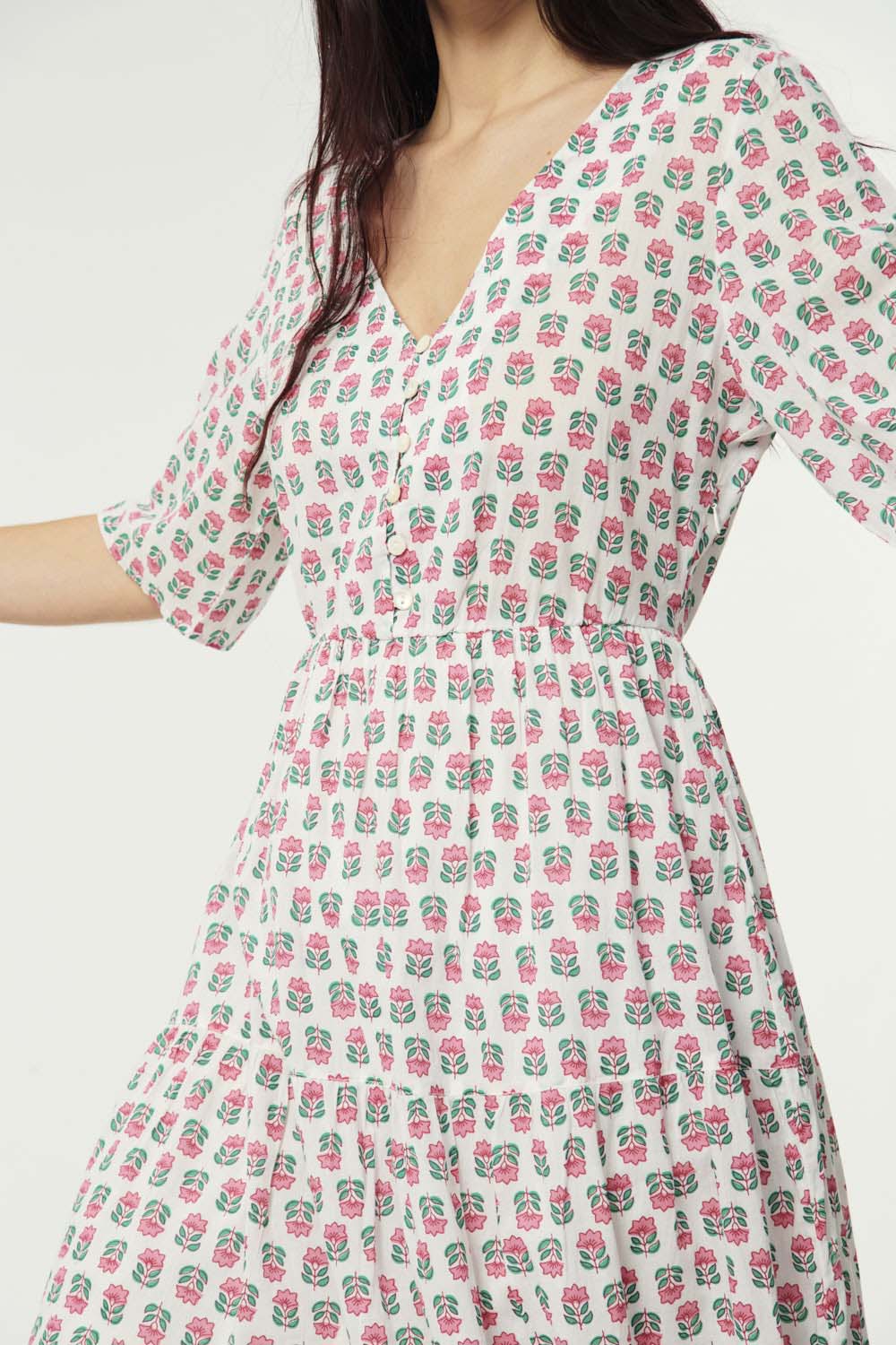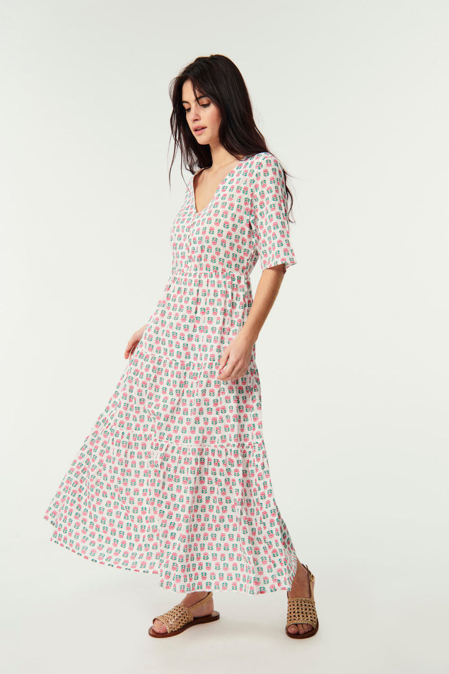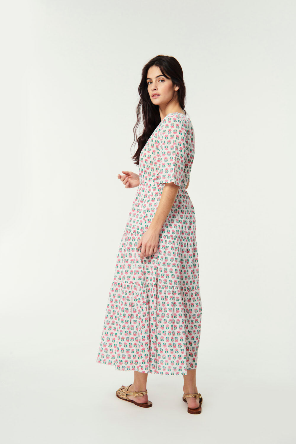 It's all about colorful boho chic styling this season, so this long cotton voile dress is perfect. Designed for summer, this beautifully made piece features short sleeves, a feminine neckline and gathered seaming.
