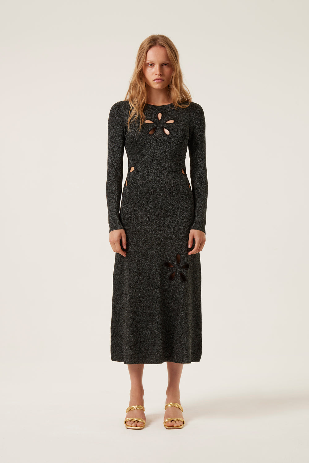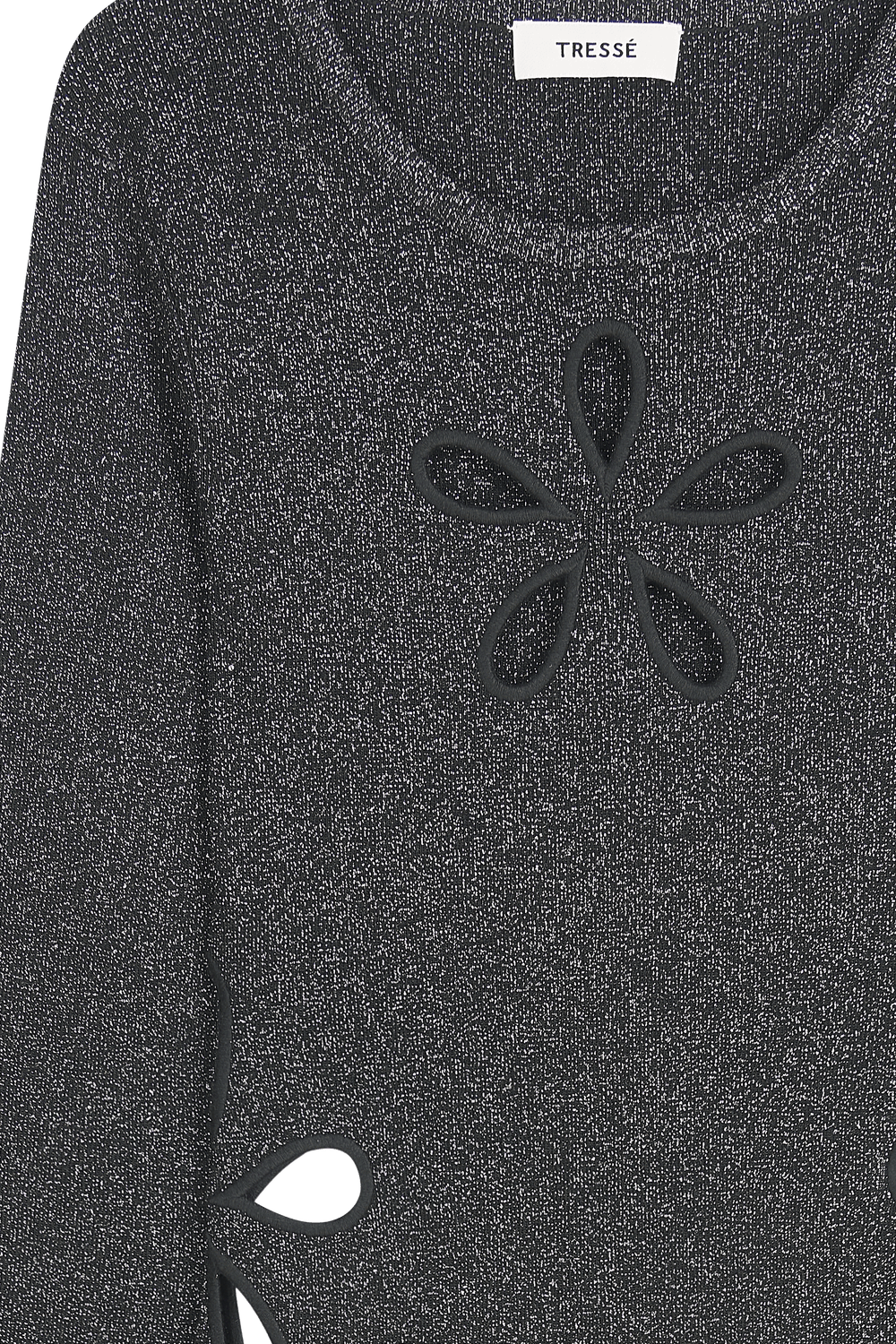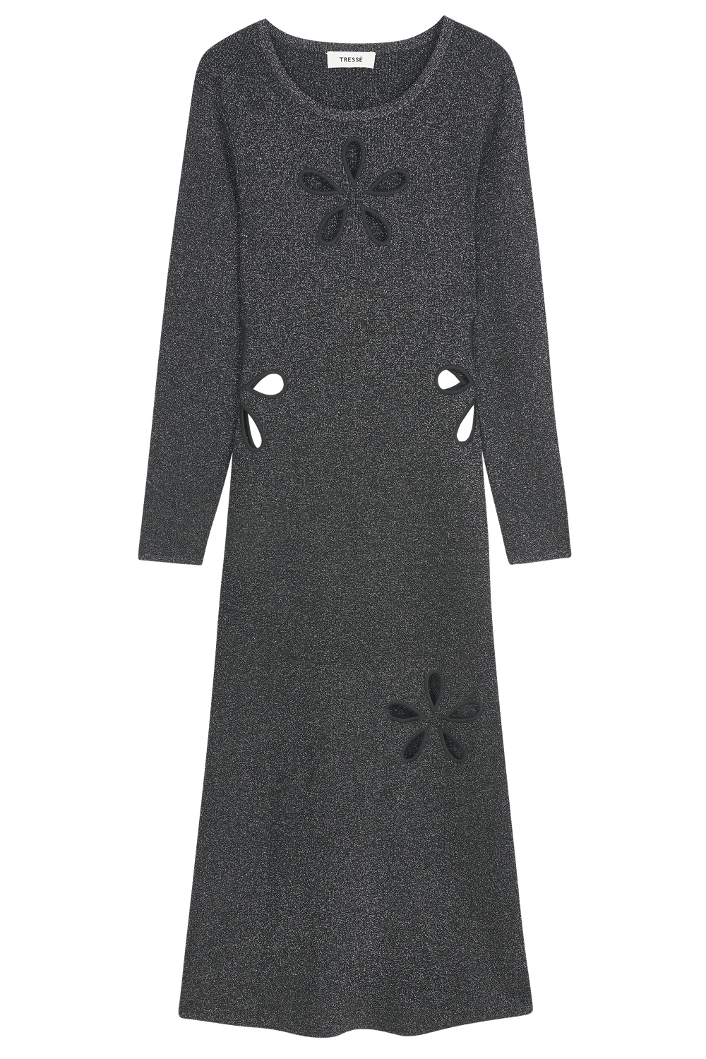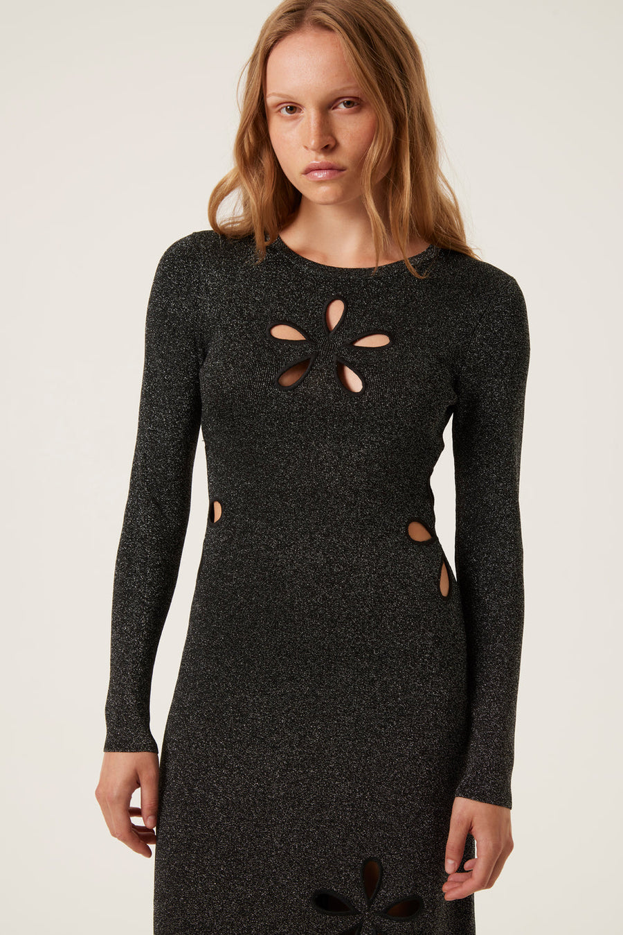 Long metallic knit dressOpenwork embroidered flower detailsMix of black and silver threads